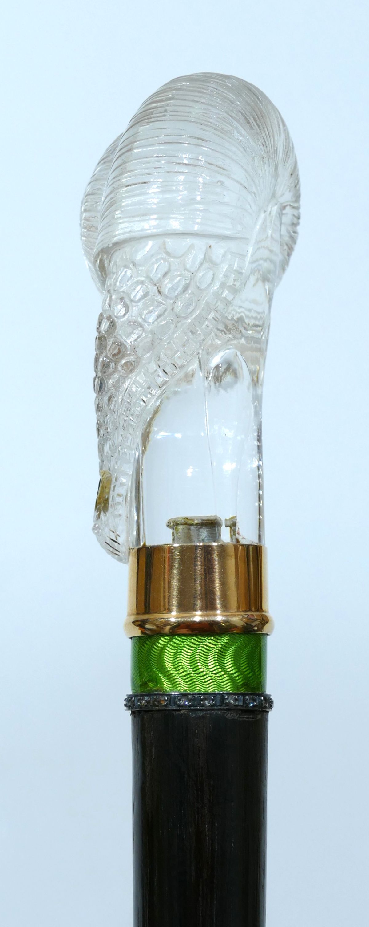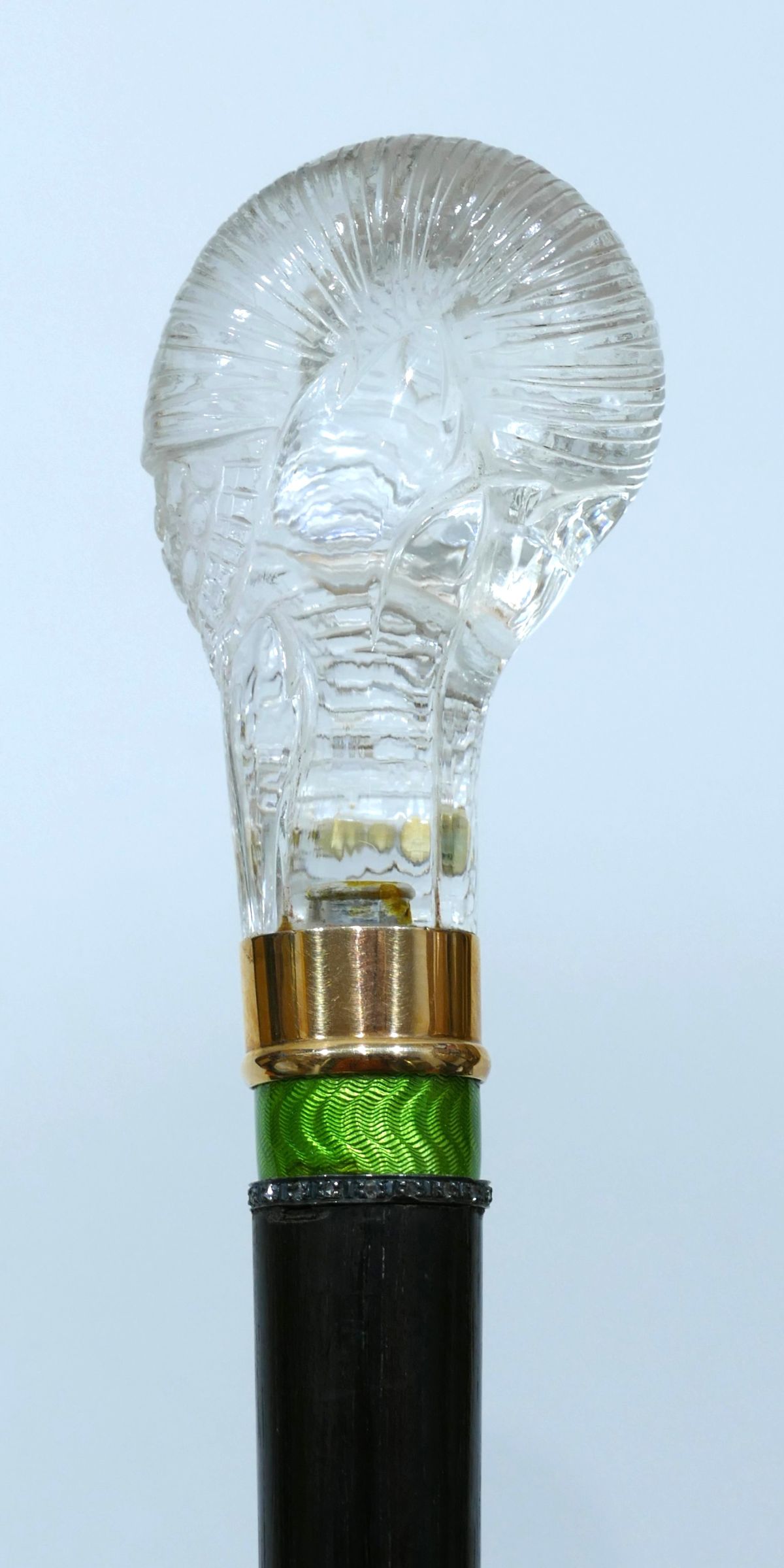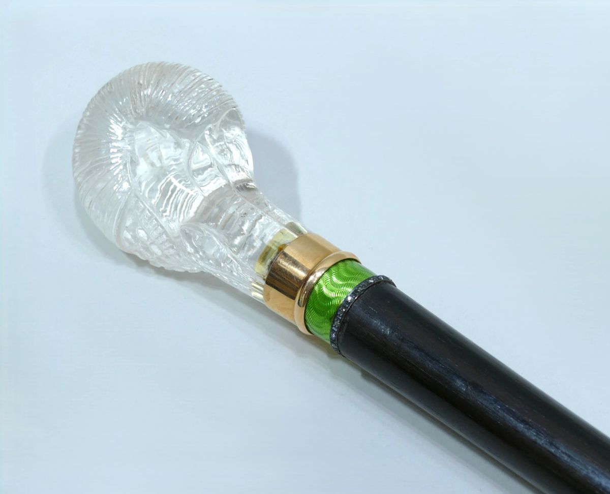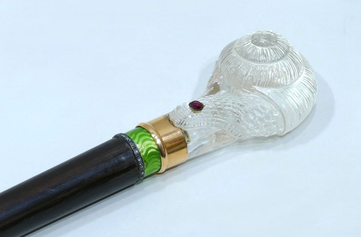 Canne de collection avec pommeau en cristal de roche, rubis et or représentant un escargot