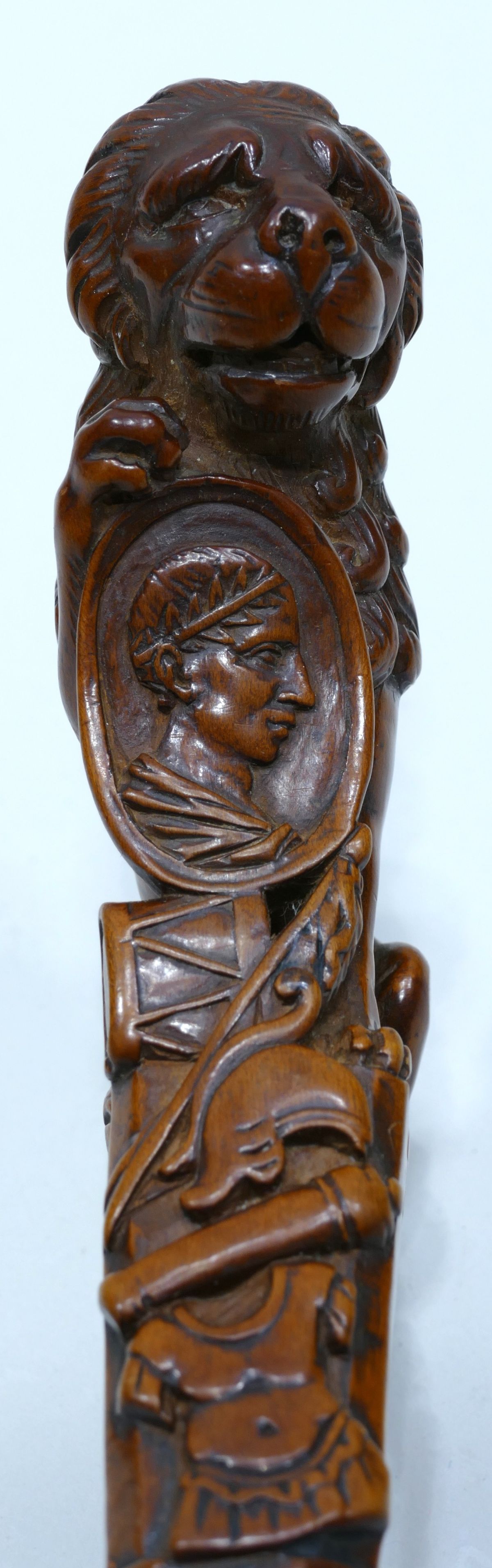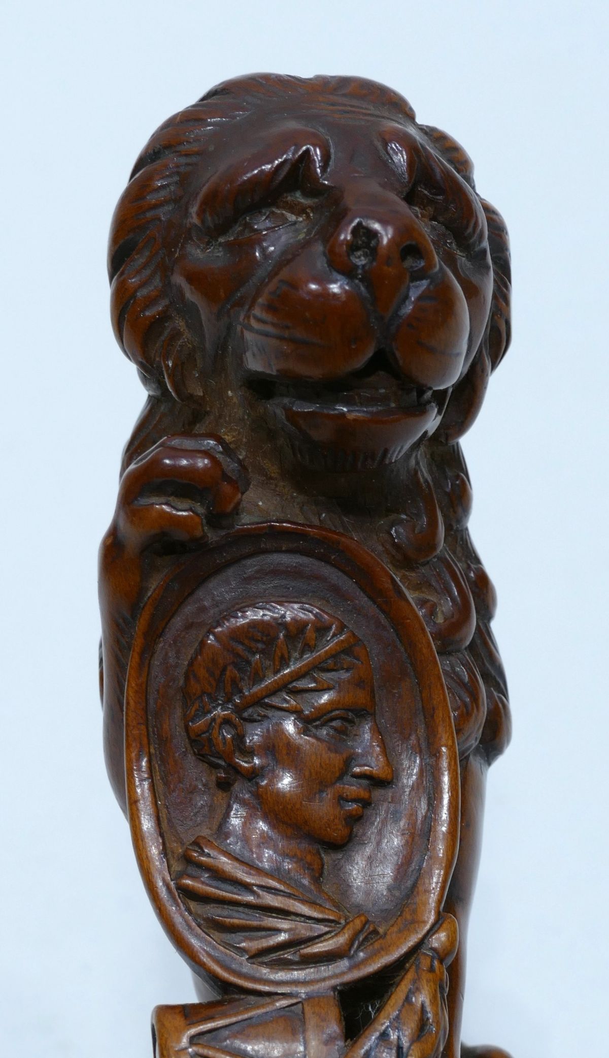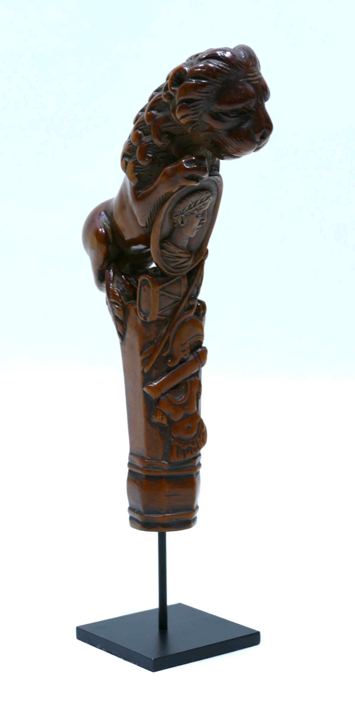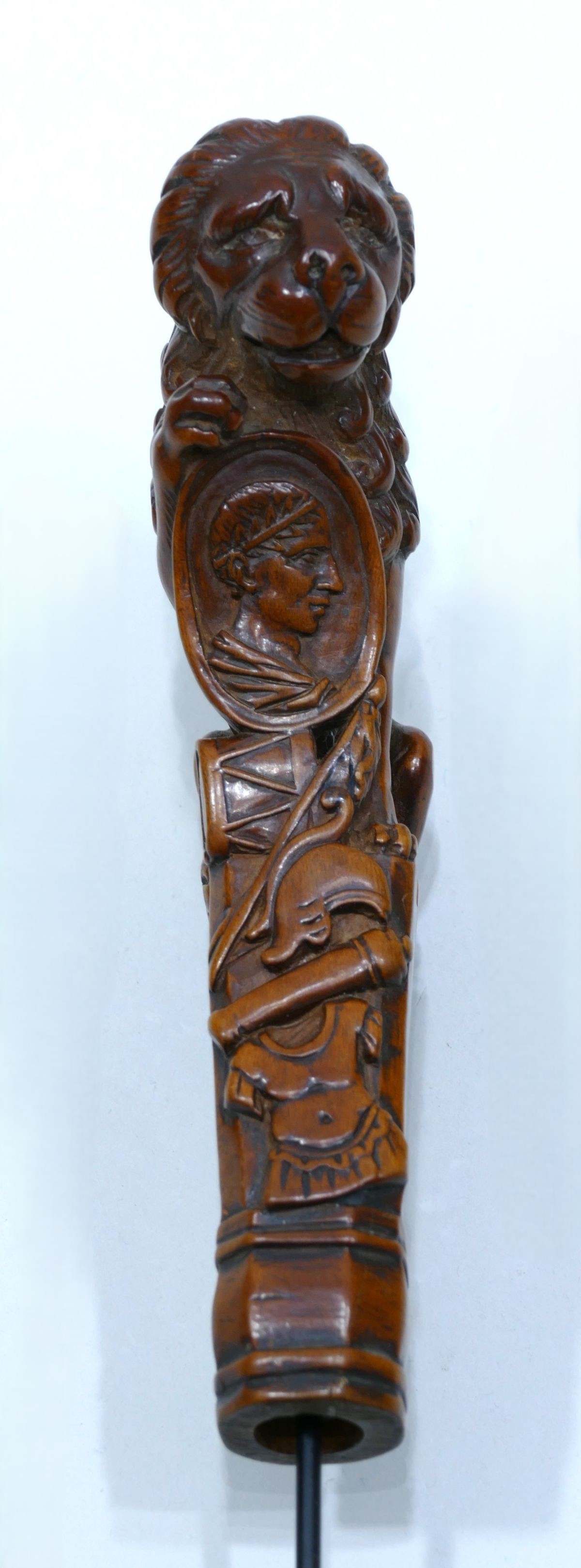 Magnifique pommeau de canne en buis sculpté représentant un lion posant sa patte sur un médaillon sur lequel figure le portrait de Jules César surmontant un tambour, un drapeau, un casque de guerrier, un canon et une armure.