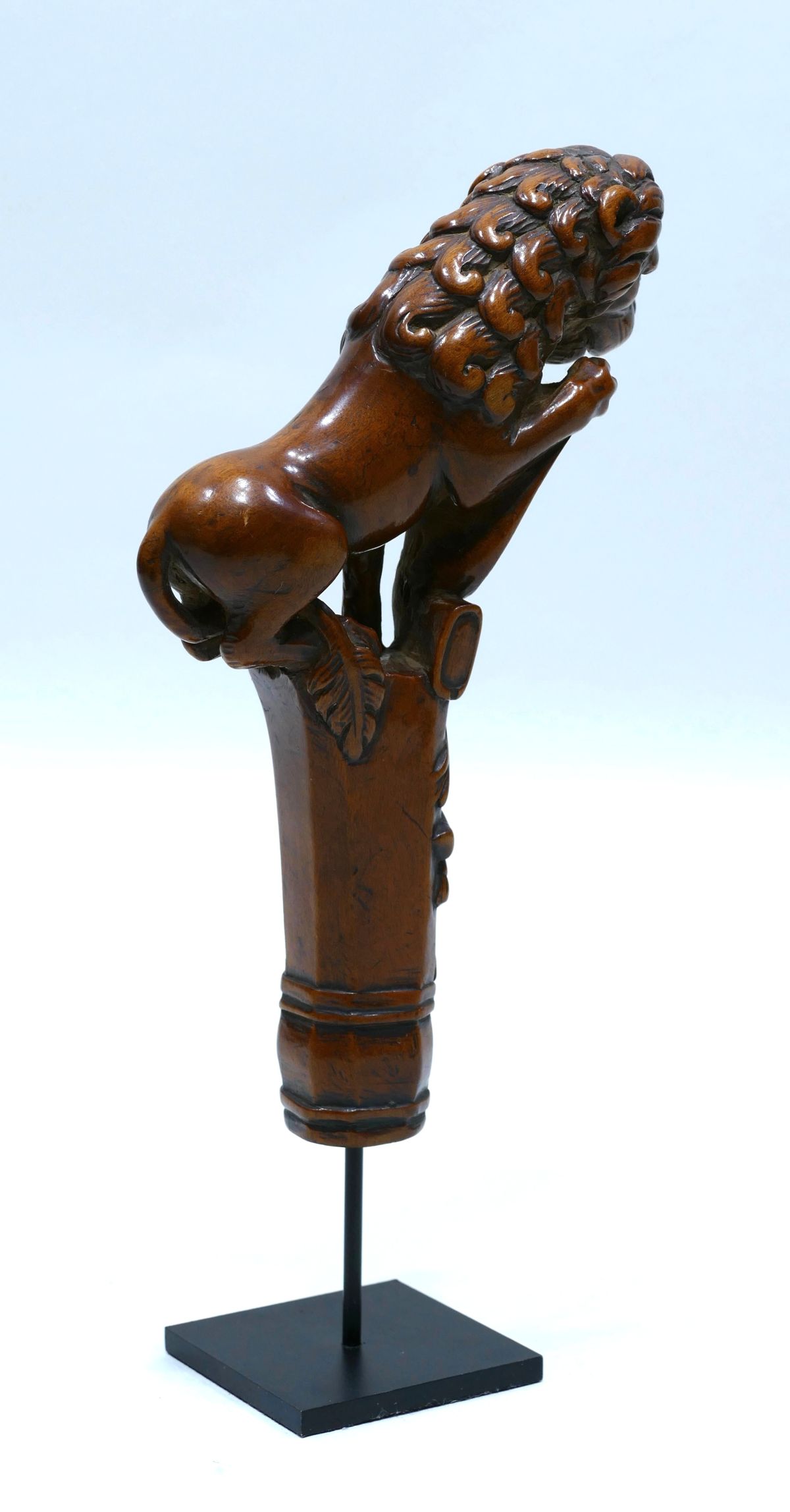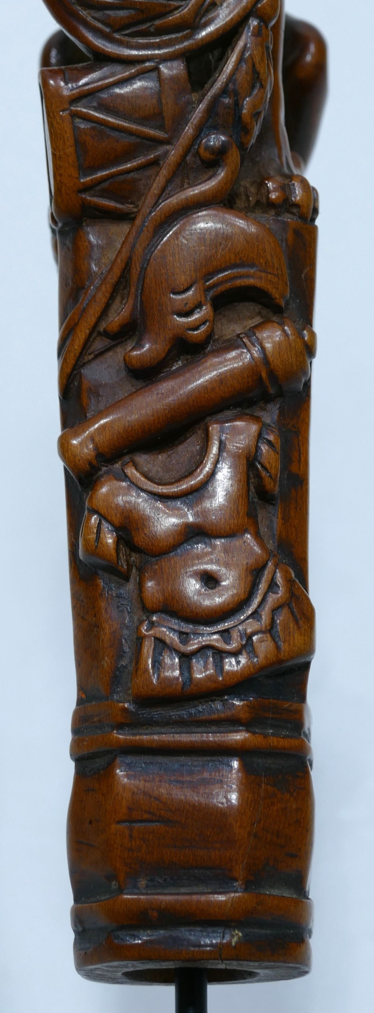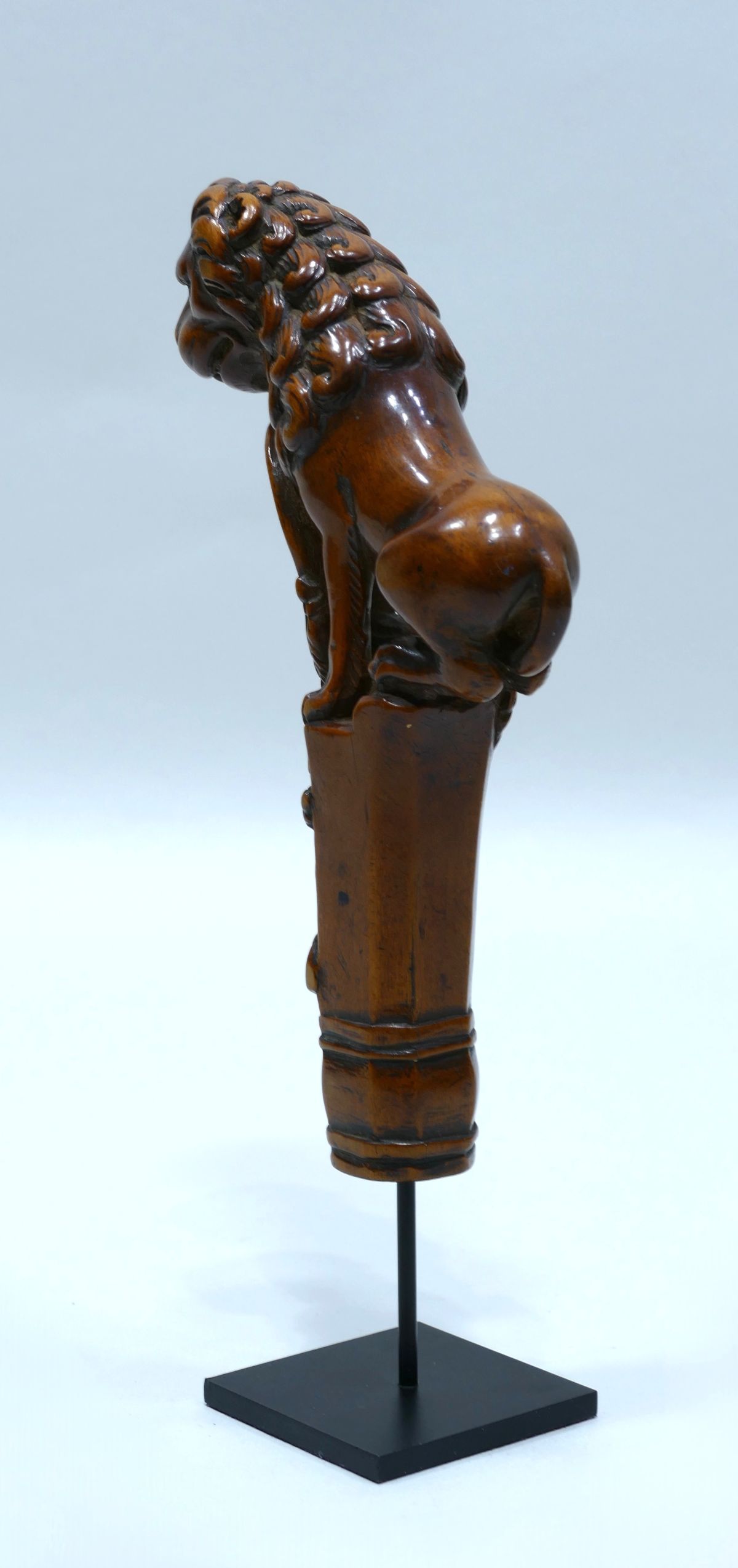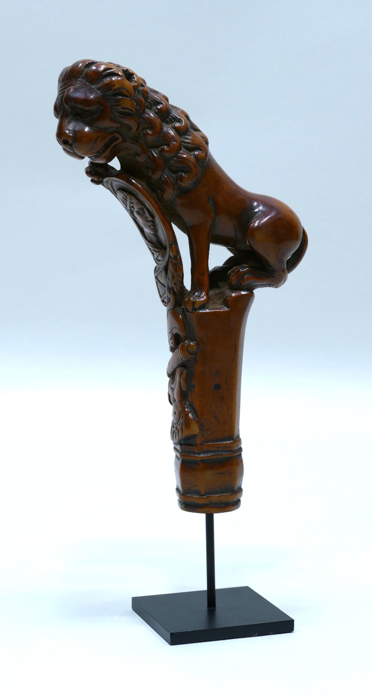 Magnifique pommeau de canne en buis sculpté représentant un lion posant sa patte sur un médaillon sur lequel figure le portrait de Jules César surmontant un tambour, un drapeau, un casque de guerrier, un canon et une armure.