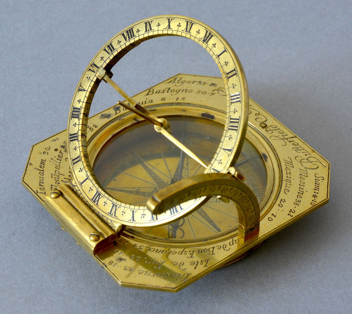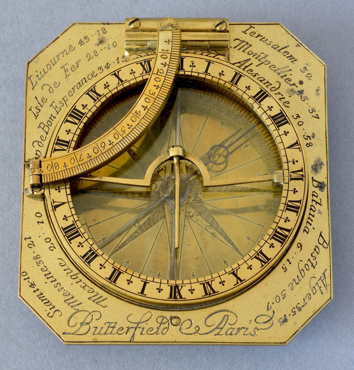 Ce cadran solaire, d’une taille relativement petite pour le type, est d’une qualité de fabrication exceptionnelle et se trouve dans un état de conservation remarquable. Les gravures sont très fines et typique d’un travail du début des années de Michel Butterfield, vers 1680. Sa particularité est que les latitudes des villes sont données avec une très grande précision pour l’époque, ce qui indique une utilisation précise du cadran comme par exemple un voyageur ou un navigateur. Ce fait est également confirmé par le fait que le dessus de la platine comporte seulement deux villes européennes, Montpellier (en France) et Bastogne (en Belgique), qui sont sans doute les villes où habite le propriétaire, ainsi que 10 villes ou régions étrangères très lointaines comme par exemple l’Isle de Fer, Le Cap de Bon Espérance, le Siam ou encore Jérusalem. Plus étonnant encore est la présence de Batavia (6°15’), une ville très proche de l’équateur situé au bord de l’océan indien. Batavia était le nom du siège de la Compagnie néerlandaise des Indes orientales en Insulinde de 1619 à 1799 puis la capitale des Indes néerlandaises de 1799 à 1742. C’est l’actuelle ville de Jakarta, ancienne capitale et plus grande ville de la république d’Indonésie. Enfin, la présence de l’Isle de Fer (28°10’) est caractéristique d’un grand navigateur car c’est aussi le point de référence des méridiens à cette époque. En tant que méridien d’origine, l’Isle de Fer sera remplacée par le méridien de Paris après la révolution française puis par celui de Greenwich au début du 20e siècle.