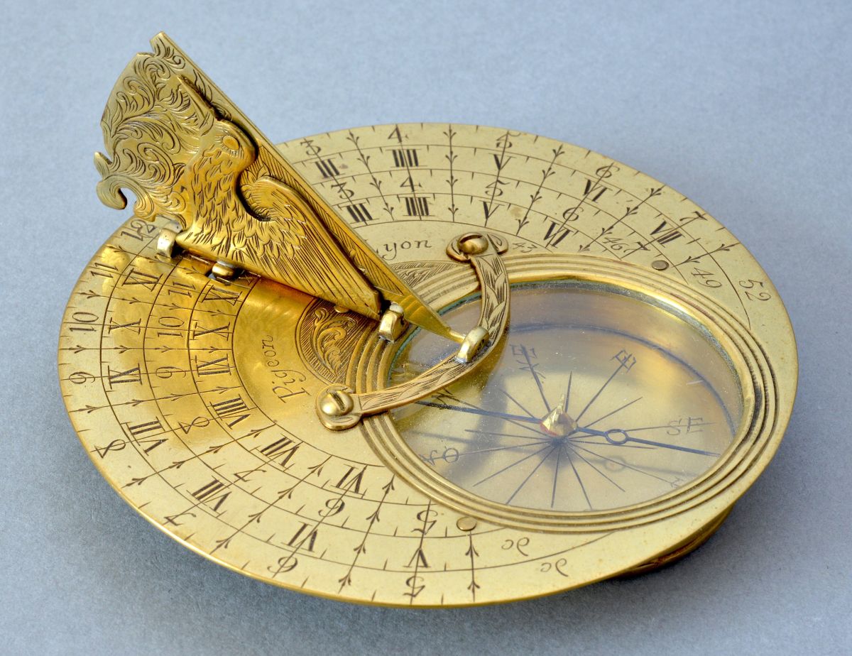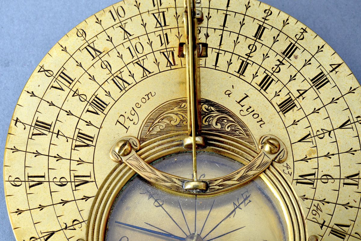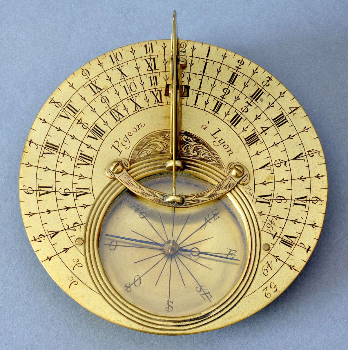 Au centre la signature « Pigeon à Lyon » avec un petit décor de volutes. Le style-axe à l’oiseau présente un décor de volutes avec d’un côté une échelle des latitudes de 40 à 60 degrés. A noter la fixation très originale de ce gnomon grâce à un arc de cercle vissé au-dessus de la boussole. Cette dernière graduée dans le fond de seize directions cardinales avec au centre un pivot d’acier supportant une aiguille en acier bleui à pivot de laiton.