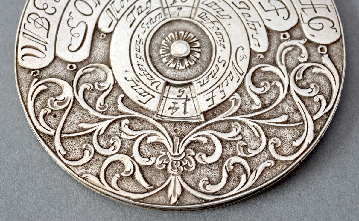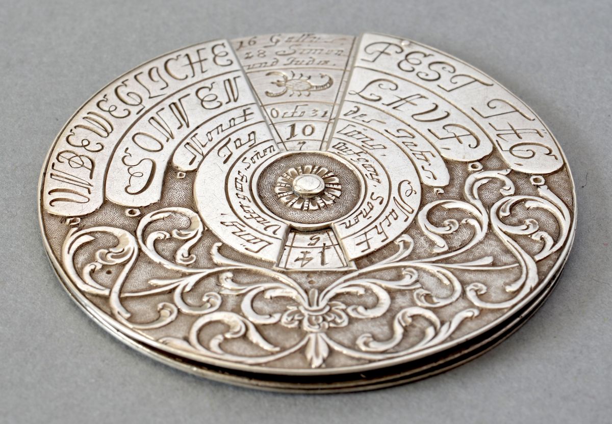 - La seconde, nommée « Die Alte Zeit » (les jours précédents), correspond aux jours écrits en abrégés avec une fenêtre à l’intérieur du disque. Entre ces deux échelles on trouve un décor d’entrelacs en relief et une frise de losange en périphérie. Les graduations des échelles sont gravées sur le disque central.