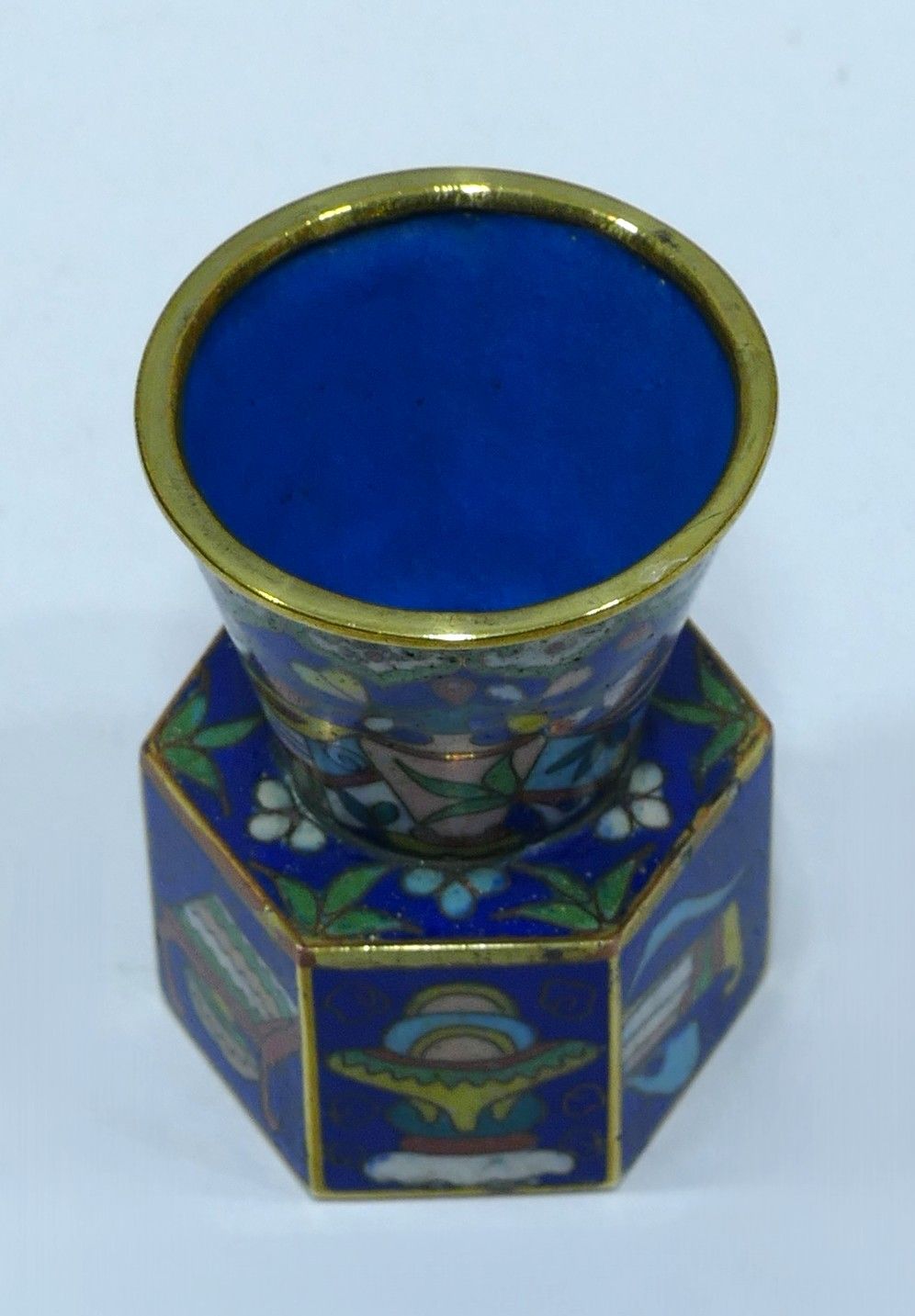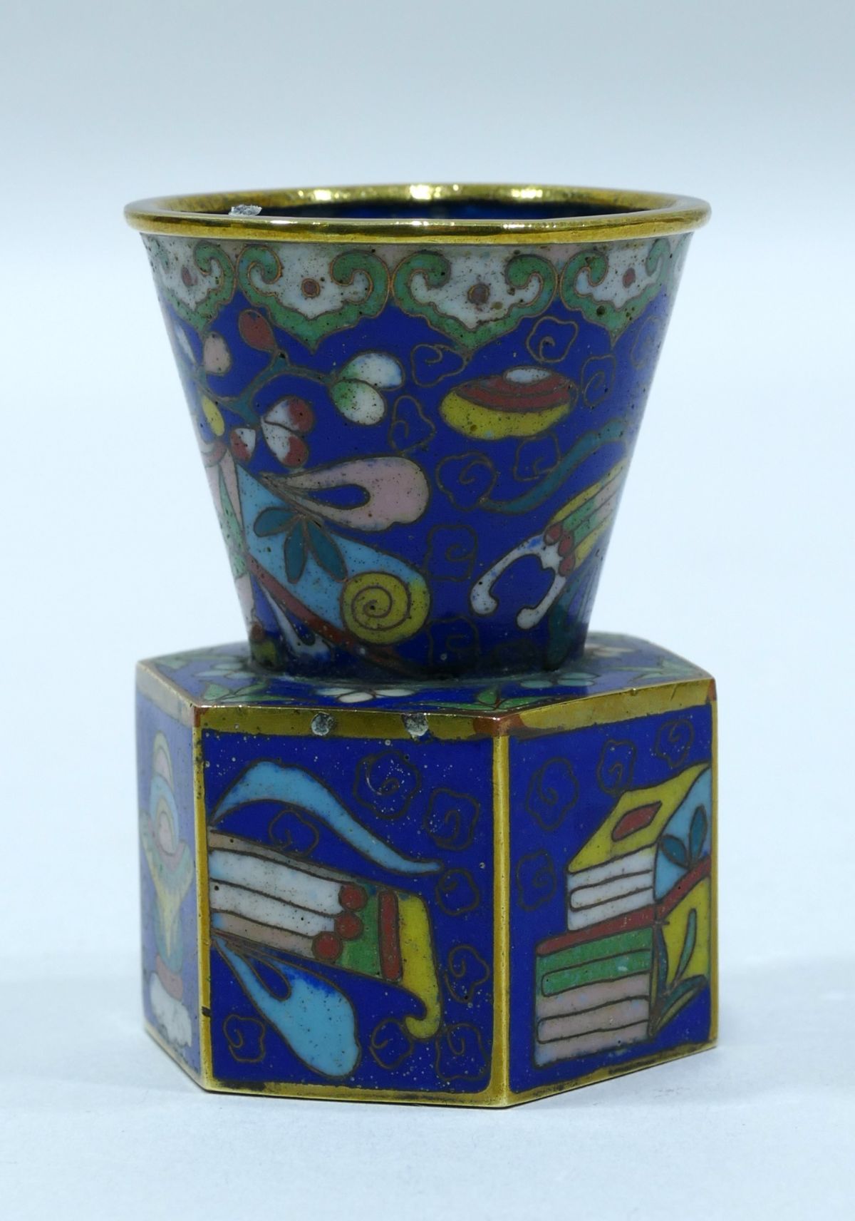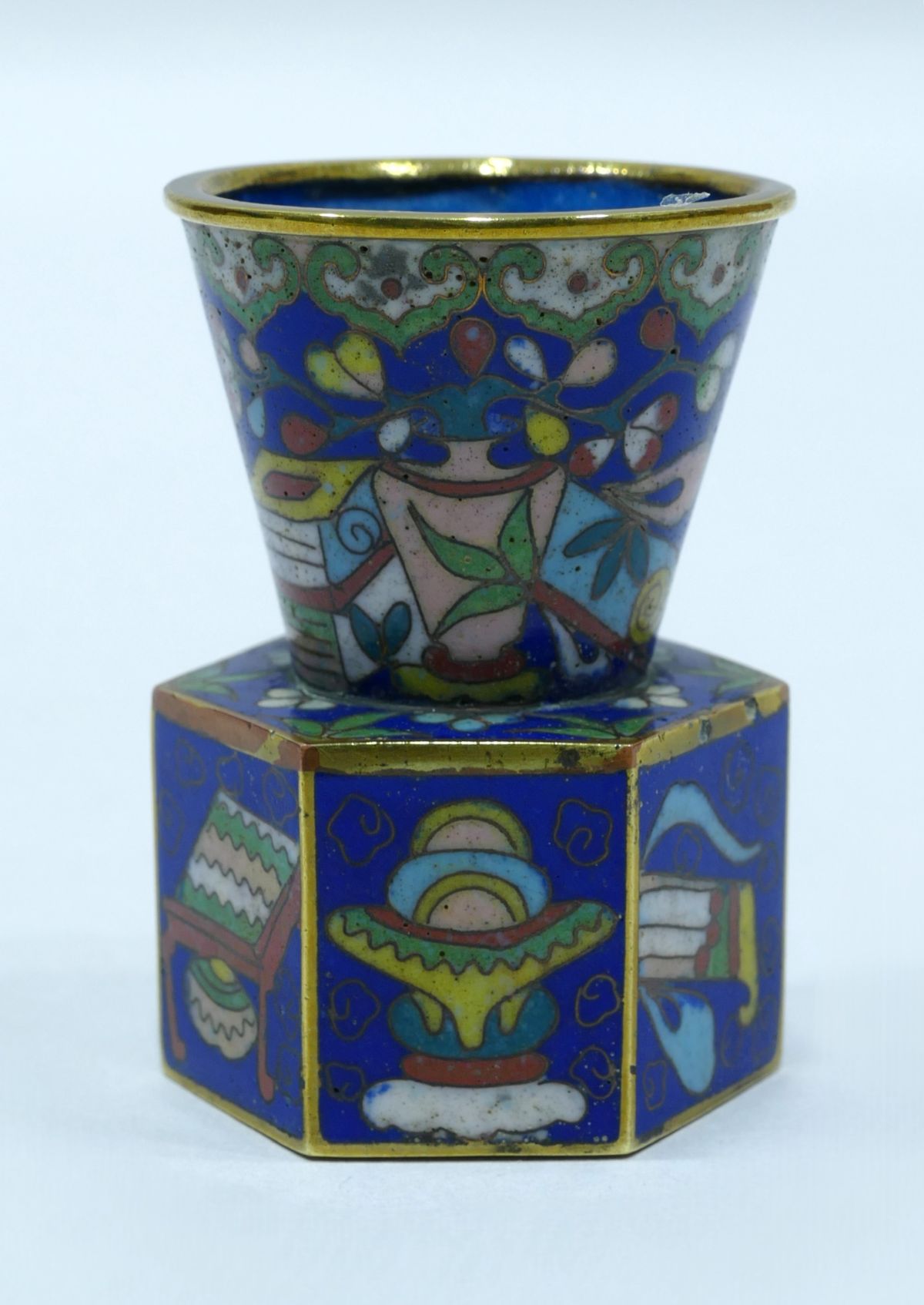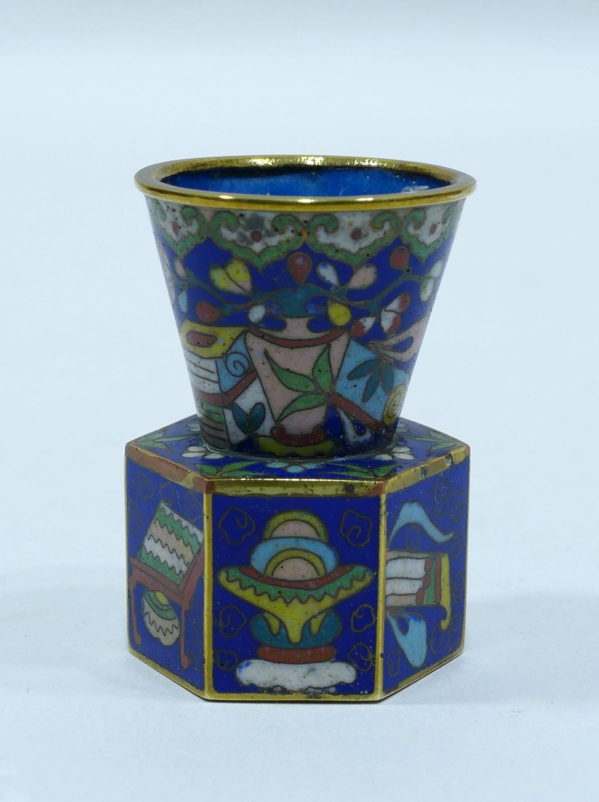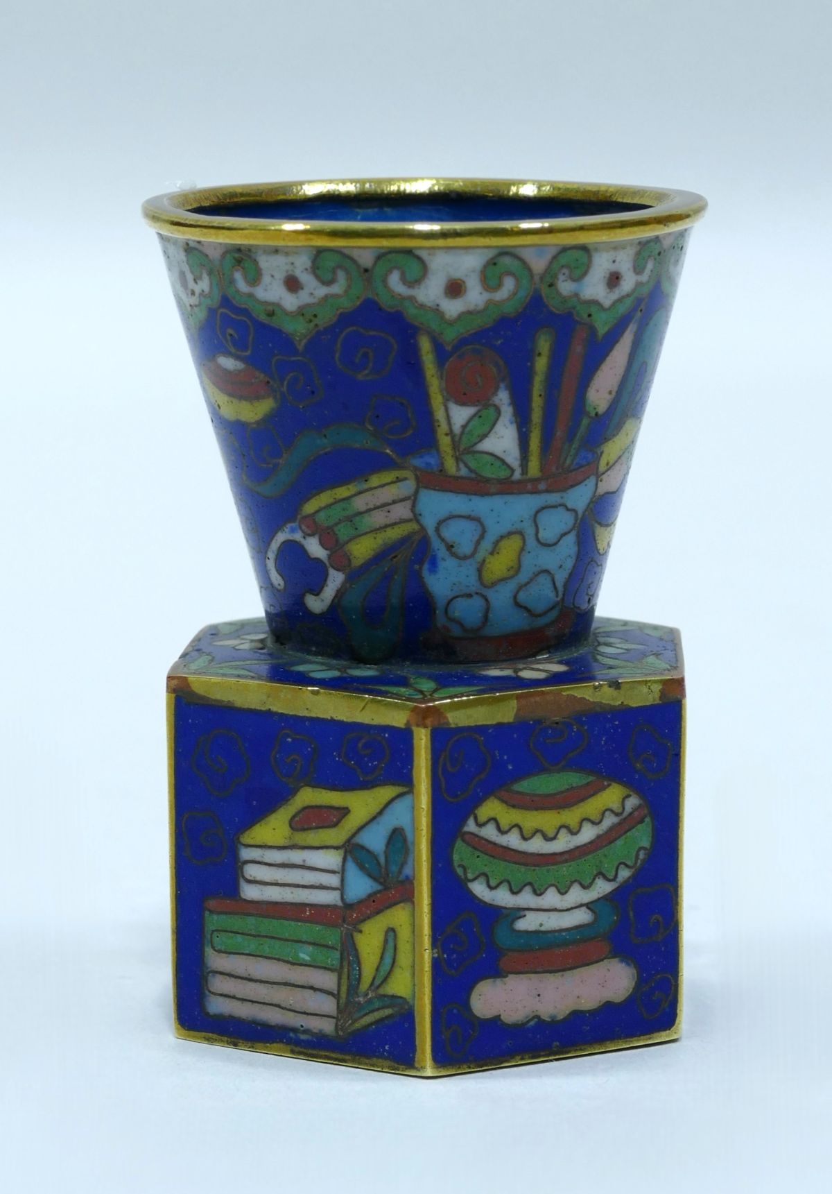 Crachoir à opium en cloisonné à dominante bleu marine avec base hexagonale, l’ensemble à multiples décors d’objets de lettré
