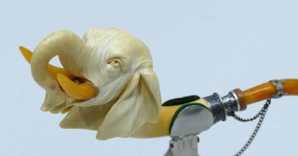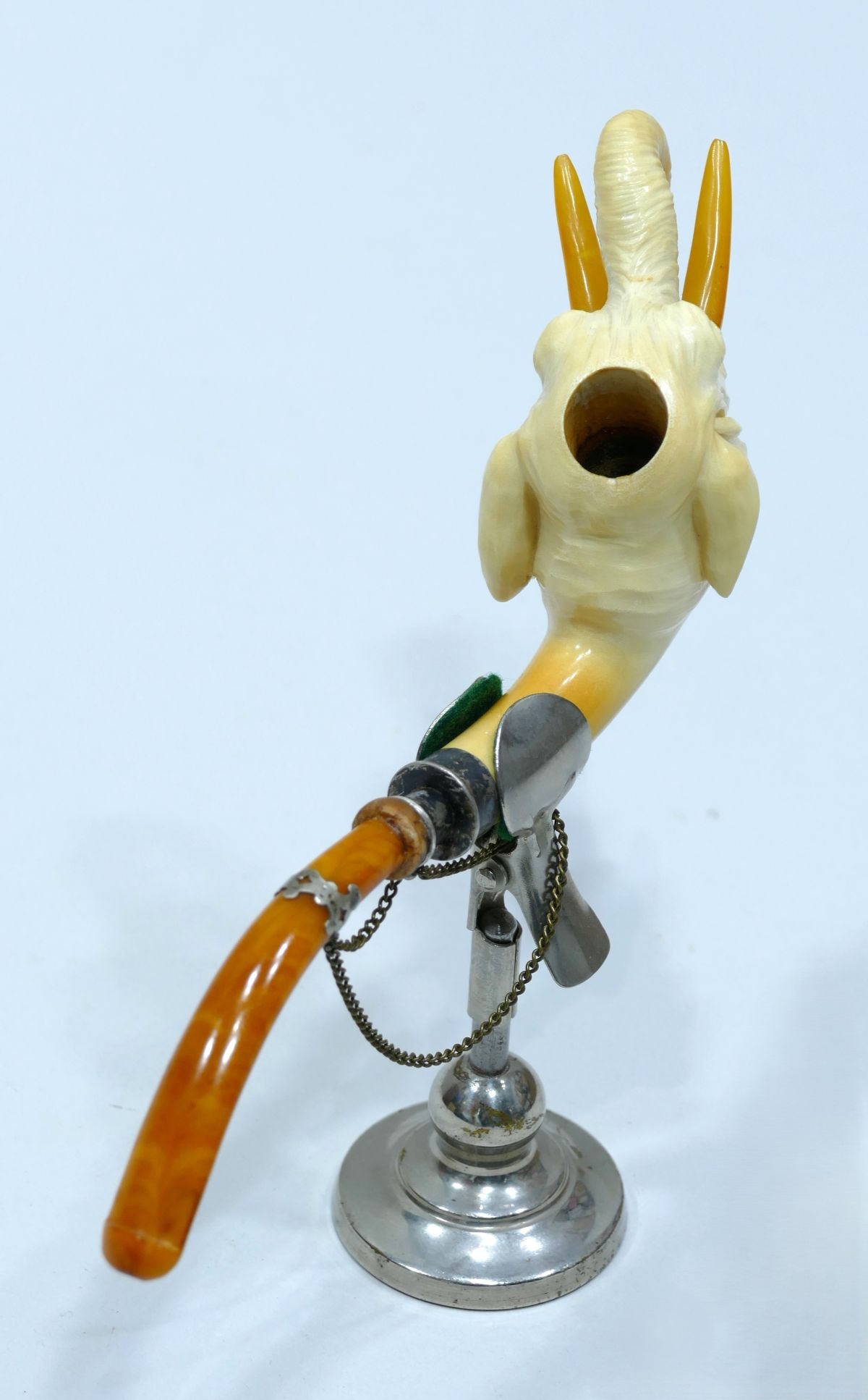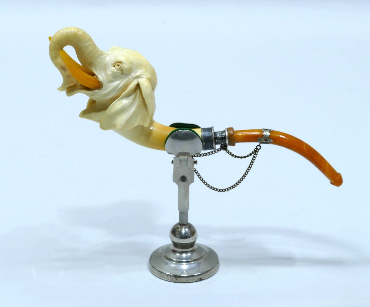 Fume-cigare en écume de mer représentant la tête d’un éléphant avec ses défenses en ambre.